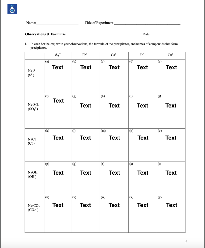 Chemical Formula Writing Worksheet Solutions Write chemical formulas for the compounds in each box. The names are found by finding the intersection between the cations and anions. Example: The first box is the intersection between the "zinc" cation and the "chloride" anion, so you should write "ZnCl 2", as shown.