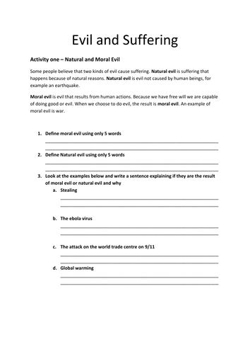 Guided Analysis: Suffering Worksheet. 2. Briefly summarize the problem of evil and suffering. Cite and reference Chapter 9 in the textbook. "Suffering can come in many forms, but, at some point, everyone will suffer deep pain or loss—it is an unavoidable fact of being human (Sharpe, 2014).". The main problem of evil and suffering is why ...
