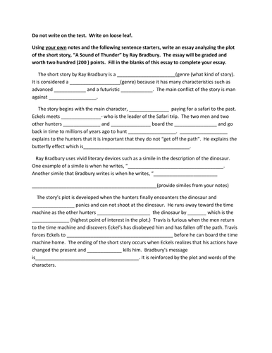 This "A Sound of Thunder" Worksheet graphic organizer also includes: Answer Key. Join to access all included materials. In this "A Sound of Thunder" worksheet group, students complete a graphic organizer for the plot of the story. Students then complete activities with vocabulary from the reading and edit passages from the text.