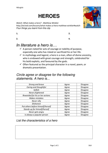 A worksheet exploring the theme of Heroes - the journey of a hero, what defines a hero, heroes in the students lives.