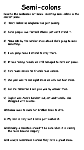 3 | Colons and semicolons worksheet These KS2 grammar teaching sequences for colons and semicolons have been designed to help children revisit and remember a key grammatical concept from the National Curriculum programme of study. Each session provides a motivating and memorable image to stimulate discussion, before introducing the grammar element. Commas, Semicolons, and Colons Review Worksheet. by. Teacher in the Rye. 62. $1.50. PDF. Compatible with. This is a review worksheet for using commas, semi-colons, and colons, meant to be used in preparation for a quiz. There are four sections on the review worksheet. Semicolons are also used to join two or more related clauses when conjunction or a preposition like and, the, but, or, nor are not used in a sentence. An example of a sentence that uses a semicolon to join with the next sentence is: "I will help you; this is my promise."