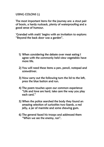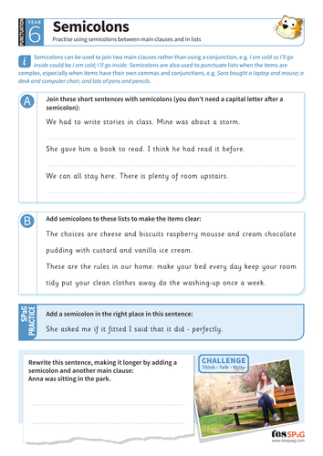 3 | Colons and semicolons worksheet These KS2 grammar teaching sequences for colons and semicolons have been designed to help children revisit and remember a key grammatical concept from the National Curriculum programme of study. Each session provides a motivating and memorable image to stimulate discussion, before introducing the grammar element.