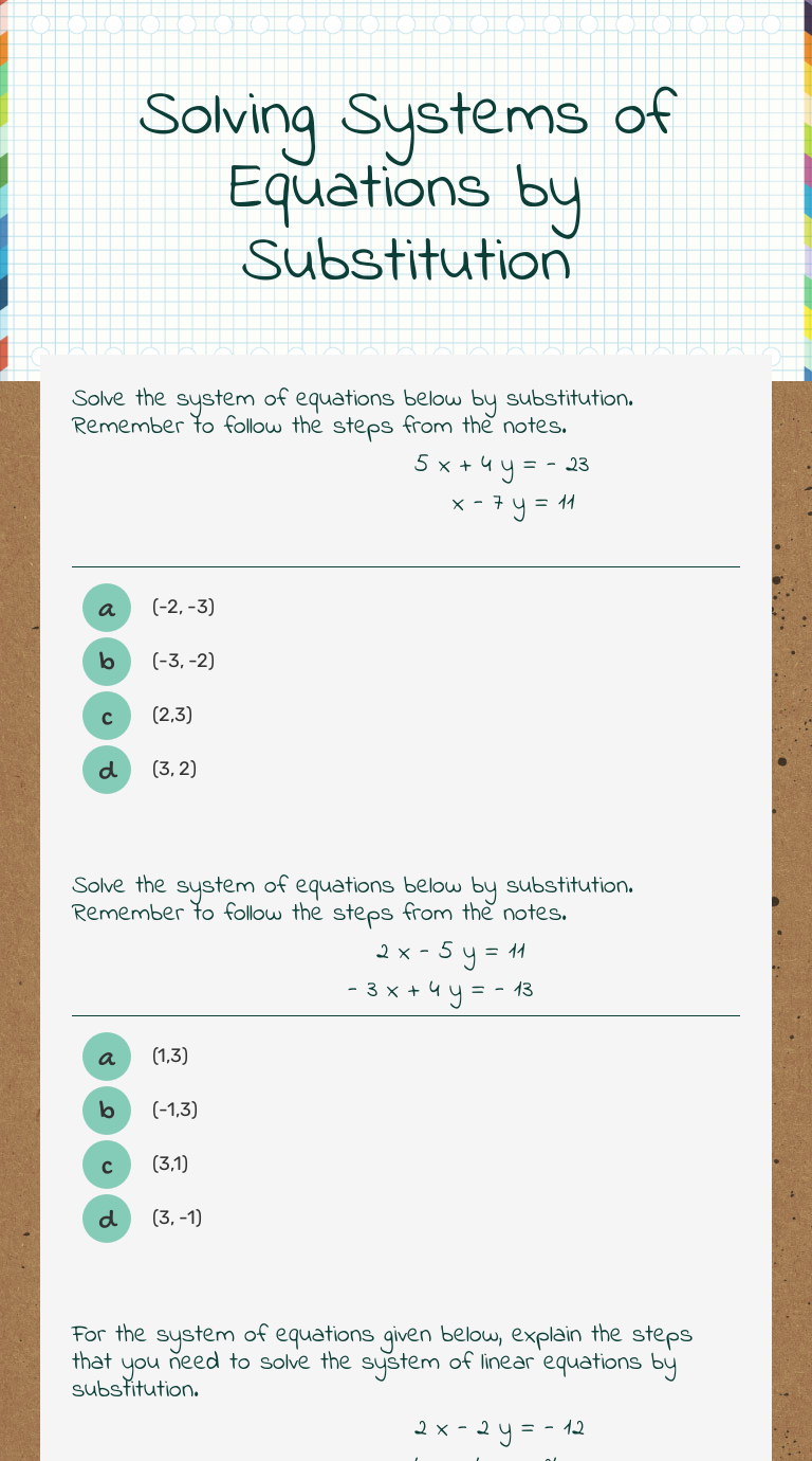 Solving systems of linear equations by substitution worksheet. Substitution Method Worksheet. 1) 2x + 8y = 20 2) x = 5. y = 2 2x + y = 10. 3) 5x – 2y = 3 4) 2y + x = -15. y = 2x x = 3y. 5) 4x + 7y = 19 6) y = 6x + 11. 21 May 2020 — Substitution Method Worksheet Solve the Systems of Equations by the Substitution Method Exercise 1 $left{begin{matrix} 3x - 4y = -6 \ 2x + ... Rating: 4 · 5 votes Objective: Solve systems of equations using substitution. ... able to reduce the system to a single linear equation which we can easily solve for.8 pages Worksheet by Kuta Software LLC ... Solving Systems of Equations by Substitution. Solve each system by substitution. 1) y = 6x − 11. −2x − 3y = −7.4 pages