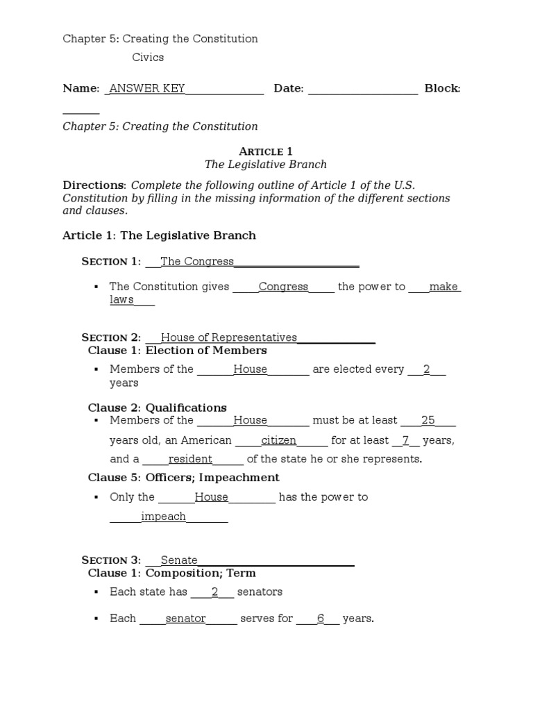 The united states constitution worksheet answers. The _____ratification of 9 states_____ shall be sufficient for the establishment of the Constitution between the states so ratifying the same. Chapter 5: Creating the Constitution Civics. Chapter 5: Creating the Constitution Civics. Chapter 5: Creating the Constitution Civics AP United States Government and Politics FRQ PACKET. Name Date. U S History Regents Scavenger Hunt Review Packet. Constitution Worksheet. Answers United ... The United States Constitution. 7th Grade Social Studies Worksheets and Answer key, Study Guides. Covers the following skills: Explain how specific provisions of the United States Constitution, including the Bill of Rights, limit the powers of government in order to protect the rights of individuals. U.S. National Standards. The U.S. Constitution Worksheet ... Large States Plan | Bicameral or 2 House Small States Plan ... What are the Constitutional duties of the President?8 pages