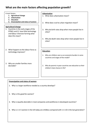 Mar 30, 2013 - Demographic Transition Model - Student Questions & Answer KeyThese are a number of thoughtful questions presented to students after having worked with and spent time with the Demographic Transition model. Students will have to show an understanding of what they know and what they have learned bo... In which stage of the Demographic Transition Model would you put the following statements: Politicians worry more about the 'oldies' vote. A worldwide immunization programme eradicates a disease responsible for the death of millions. Governments introduce tax incentives for families who have more than two children. The immigration of skilled workers and their families is […] 29 Nov 2021 — DTM) has five stages that can be used to explain population increases or decreases. The DTM is a key tool for understanding global and regional ...