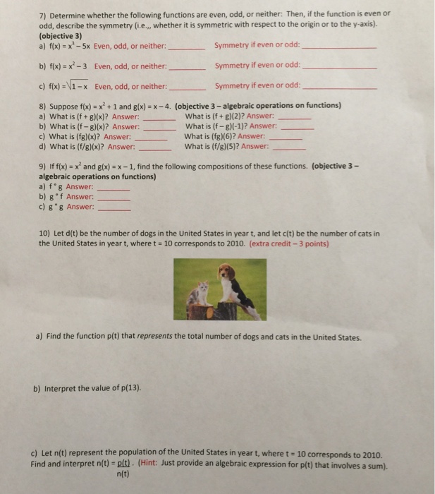 Even and odd functions worksheet with answers. Functions versus relations 248404. 42 10 5 5 10 x y find the domain and range of each function. Some of the worksheets for this concept are functions 1 work inverse functions inverse relations find the evaluating functions date period function table es1 work logarithmic function function operations date period even and odd functions determining functions practice a. Identifying functions worksheets are up for grabs. Equip 8th grade and high school students with this printable practice set to assist them in analyzing relations expressed as ordered pairs, mapping diagrams, input-output tables, graphs and equations to figure out which one of these relations are functions based on the pairing of the domain (x) and range (y). functions worksheet answers. com-2021-10-28T00:00:00+00:01 Subject: Graphing Rational Functions Word Problems With Answers Keywords: graphing, rational, functions, word, problems, ... graphing rational functions. If a function is even or odd, then half of the function can beJan 23, Some of the worksheets for this concept are functions 1 work inverse functions inverse relations find the evaluating functions date period function table es1 work logarithmic function function operations date period even and odd functions determining functions practice a. 1 f x x g x x find f g 2 h n n n g n n. Function operations worksheet ...