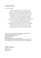 Shakespeare- Sonnet 18 . Shall I compare thee to a summer's day? Thou art more lovely and more temperate: Rough winds do shake the darling buds of May, And summer's lease hath all too short a date: Sometime too hot the eye of heaven shines, And often is his gold complexion dimm'd; And every fair from fair sometime declines,