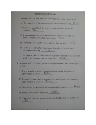 To investigate Hooke's Law not being obeyed, elastic bands can be ... Answer Description. 1. 2(B). Hooke's Law Definition ... Hooke's Law Worksheet.4 pages What was the spring constant? 12) A 75 N force stretches a spring 175 cm. What was the proportionality constant? Answers: 1) 1.05 N 2) ...2 pages