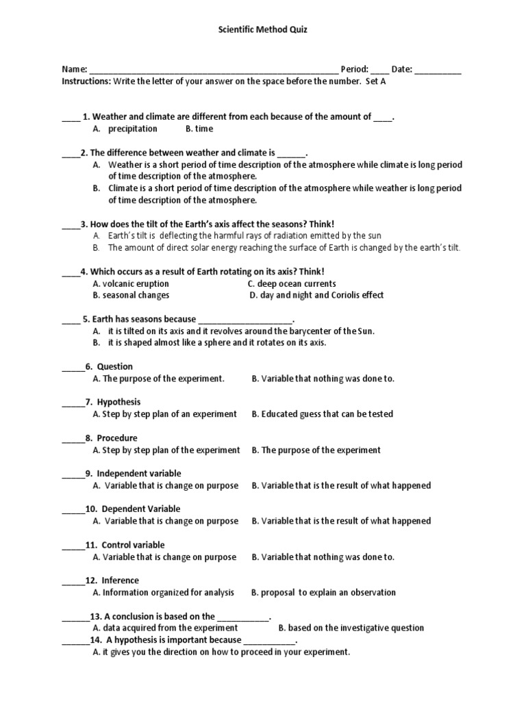 Scientific method questions worksheet. Introduction to the Scientific Method Worksheet Long ago, many people believed that living things could come from nonliving things. They thought that worms came from wood and that maggots came from decaying meat. This idea was called spontaneous generation. In 1668, an Italian biologist, Francesco Redi, did experiments to prove that maggots did not come from … On this free scientific method worksheet is a visual you will see the basic terms: Purpose – The question that needs to be answered or the problem that needs to be resolved Research – The observing and collecting of evidence Hypothesis – The best guess for how to answer the question or solve the problem Experiment – The testing of the hypothesis Exploring the Scientific Method The scientific method is a process that scientists use to better understand the world around them. It includes making observations and asking a question, forming a hypothesis, designing an experiment, collecting and analyzing data, and drawing a conclusion. This is sometimes also referred to as scientific inquiry. A hypothesis is a possible … wonderful dog! Is this statement a scientific theory? Why or why not. 8. Define scientific method. 9. Define science. 10. Define experiment. 11. Complete the following sentence: All scientific knowledge is based on _____. 12. Which of the following is an example of a good scientific question? Why? a.