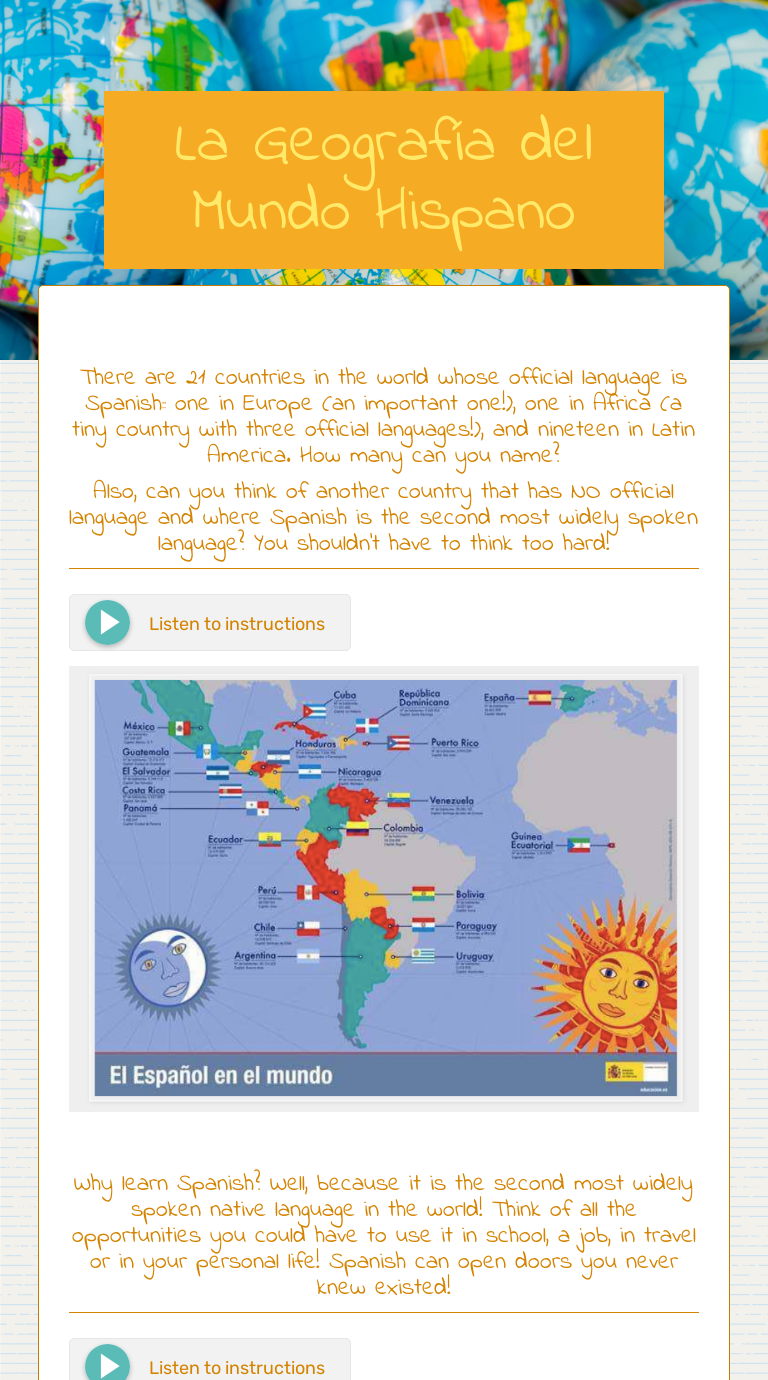 El mundo hispano worksheet. La Geografía del Mundo Hispano | Interactive Worksheet... | Wizer.me Listen to instructions. Enter a URL to embed it in your worksheet. Title (Optional). Create your own worksheet. Start creating - For free! El Mundo Hispano - El Mundo Hispano Cuando se descubri... El Mundo Hispano criatura era verde y viscoso se tenía ojos grandes y pequeñas manos . Esta criatura vagó alrededor chick fila una y comió un pollo sándwich que interactuaba con el pueblo y hablaba raro. You've reached the end of your free preview. El Mundo 21 hispano (World Languages) 002 Edition, Kindle Edition Use features like bookmarks, note taking and highlighting while reading El Mundo 21 hispano (World Languages). El Mundo 21 Hispano is agood book for native Spanish speakers. it also contains information about different countries and popular people of latin america. El Mundo Hispano Jeopardy Template El Mundo Hispano. No teams 1 team 2 teams 3 teams 4 teams 5 teams 6 teams 7 teams 8 teams 9 teams 10 teams Custom.