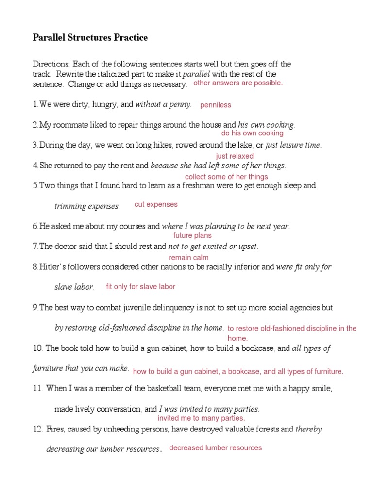 Parallel Structure Worksheet With Answers Prefect Parallel Structure Worksheet With Answers - Bad worksheets make little or no sense to college students when used independently.Worksheets must be used as a learning tool NOT a teaching device. Some college students will love impartial quiet time with a worksheet, nonetheless, the goal should be to build on ideas already taught, to not train them.