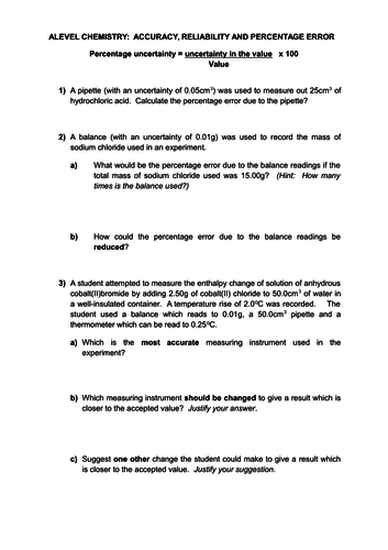 Accuracy, precision, and percent error worksheet | Check my answers You can do the exercises online or download the worksheet as pdf. ID: 2211065 Language: English School subject: Chemistry Grade/level: High School Age: 15-18 Main content: Accuracy Precision and percent error Other contents