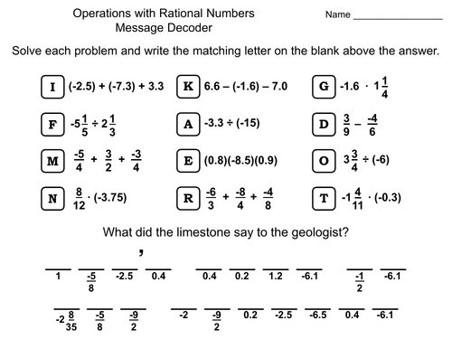 Oct 13, 2021 · Adding Subtracting Rational Numbers Positive Negative Decimals Cross Word Subtracting Rational Numbers Rational Numbers Word Activities . Multiplying And Dividing Rational Numbers Worksheet 7th Grade Or 26 Best 7th Math Chapter Subtracting Integers Dividing Integers Subtracting Integers Worksheet WHOLE NUMBERS 1. Adding 2. Subtracting 3. Multiplying 4. Dividing 5. Order of Operations FRACTIONS 6. Mixed Numbers 7. Prime Factorization 8. Least Common Multiple 9. Simplifying Fractions 10. Add & Subtract Fractions 11. Add & Subtract Mixed Numbers 12. Multiply Fractions 13. Divide Fractions DECIMALS 14. Decimals to Fractions 15. Add ... Adding and subtracting rational expressions worksheets for 6th grade and 7th grade. 1 a b2 2 a b b a 2 2 2 7 1 16 16 x x x x 3 2 4 4 3 7 16 16 t t t 4 3 3 3 3 m n n3 2 m n n m 5 2 2 4 3 a a a a 6 3 2 1 x x 7 2 2. Adding and subtracting rational expressions practice problems move your mouse over the answer to reveal the answer or click on the ... Results 1 - 24 of 2000+ — Also included in: Math Escape Room Bundle 6th 7th 8th Grade ... Adding & Subtracting Rational Numbers Worksheet - Maze Activity.