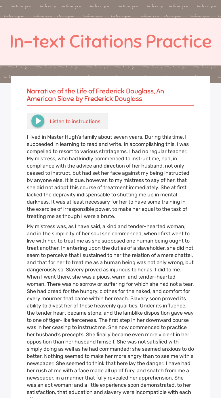 PDF Sample Prestwick HouseActivity Pack S - 67 Reproducible Student Worksheet Student's Page Narrative of the Life of Frederick Douglass Chapter X Dialogue Objective: Understanding how dialogue is constructed Activity Select one of the following dramatic incidents from Chapter 10, and write a dramatic dialogue for it. • Frederick collapses from exhaustion while fanning wheat.