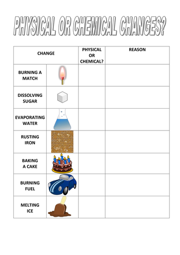 Physical and Chemical Changes Worksheet | PDF | Chemical... Dont forget - Physical changes are changes in size, shape, or state. No new substance is formed even if it may look a little different. Documents Similar To physical and chemical changes worksheet. Carousel Previous Carousel Next. 6 Helpful Physical and Chemical Change Examples And unlike physical changes, these changes usually use a lot more energy, such as heat and light, because the molecular bonds need to be broken in Both physical and chemical changes result in one thing turning into another. Whether it's a glass breaking or burning a piece of paper, the original...