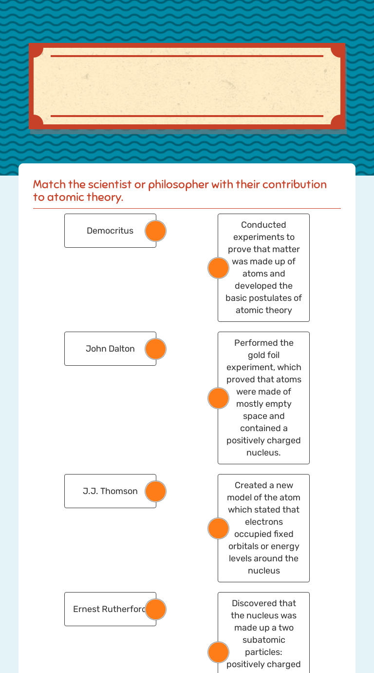 Atom Timeline worksheet ID: 2515838 Language: English School subject: Science Grade/level: 7 Age: 11-13 Main content: Atoms Other contents: parts of atom Add to my workbooks (0) Download file pdf Embed in my website or blog Add to Google Classroom