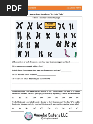 Sex-Linked Traits Remember that humans have 23 pairs of chromosomes and that the 23rd pair are the sex chromosomes. Females are XX and males are XY. The traits found on the 23rd X chromosome are called X-linked traits. If an X-linked trait is recessive, females have a 1 in 3 chance of inheriting that trait. Males have a 1 in Xlinked Answer Key - Displaying top 8 worksheets found for this concept.. Some of the worksheets for this concept are Sex linked answer key, Genetics x linked genes, Sex linked traits work 3 answer key, Sex linked traits work, Biology corner cell graphic organizer answer key, Sex linked traits work 3 answer key, Chromosome work answer key, Genetics x linked genes work answers. View karyotyping_answer_key from PHYSICS 212 at Pennsylvania State University. . _ . EAMOEBA-SISTERS'E.VIDEORECAP?- SEX:L|NKED:TRAITS"' i. Amoeba Sisters Video Recap: Sex-Linked Traits Below is a Kink Worksheet Time Addition Worksheet Summer Math Worksheets Cell Defense The Plasma Membrane Worksheet Answer Key toc worksheet malnutrition worksheet worksheet ...
