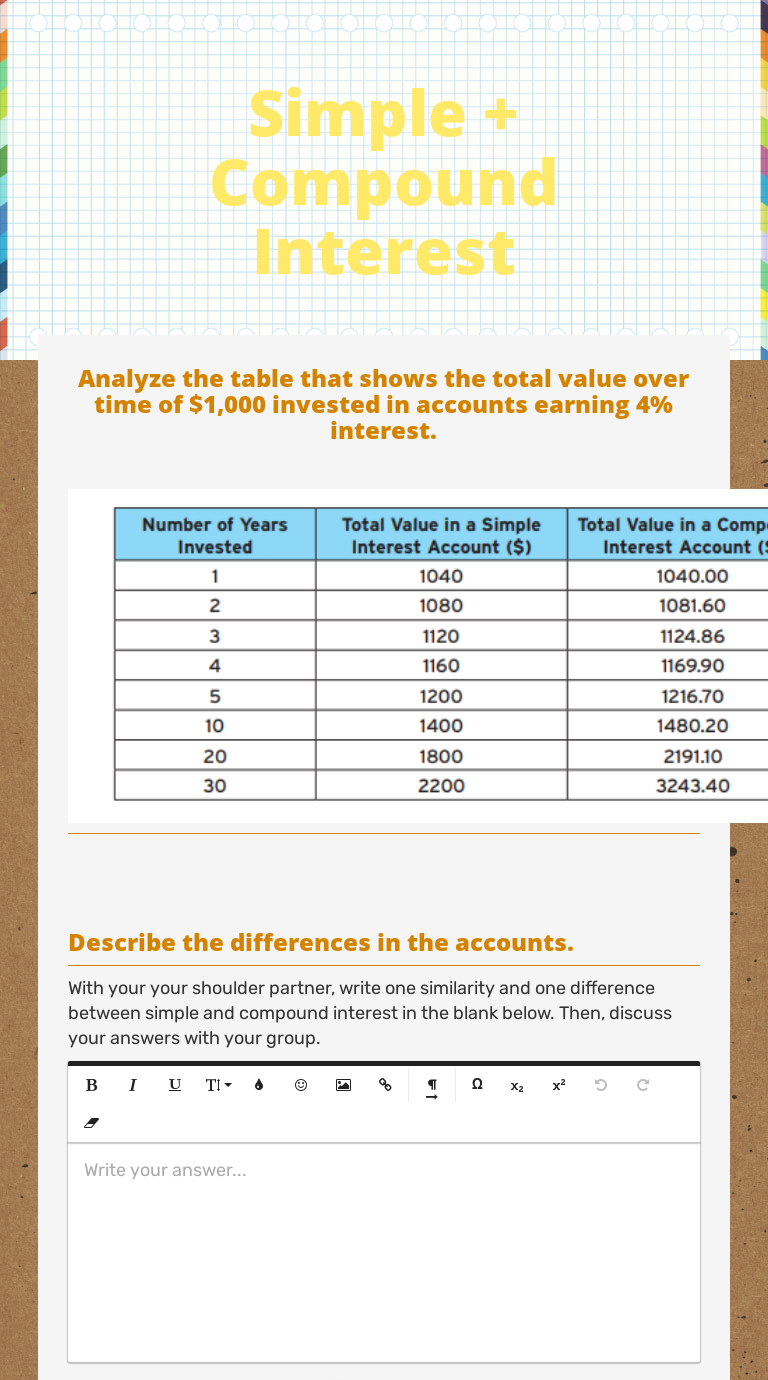 8th Grade Simple And Compound Interest Worksheet - Explore ... Simple and compound interest worksheet 1 write as decimals. Grade 7 and 8 math worksheets with answers. This four page worksheet contains 20 interest problems. They determine the total value of investments compounded over a period of years. A 4 b 7 8 c 10 3 d 16 e. I 5 prt use the simple interest formula.