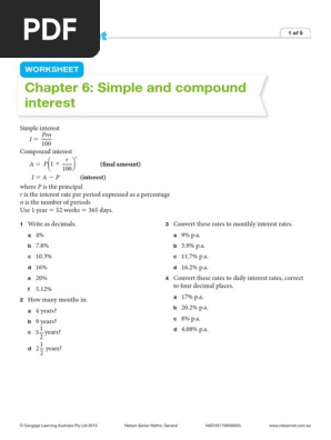 Simple And Compound Interest Worksheet Answers Pdf ... Simple And Compound Interest Worksheet Answers Pdf December 23, 2021 Simple interest i 5 100 prn compound interest a 5 1 100 p r n 1 final amount i 5 a 2 p interest where p is the principal r is the interest rate per period expressed as a percentage n is the number of periods use 1 year 5 52 weeks 5 365 days.