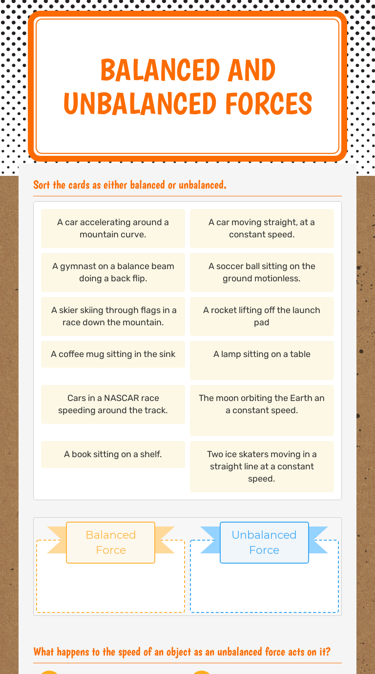 Balanced and Unbalanced Forces | Interactive Worksheet by... Balanced and Unbalanced Forces Worksheet. September 30, 2020. Q: 6-15, Sorting Facts about Balanced vs Unbalanced Forces. Click each box to sort it into the correct category. Does not cause acceleration.