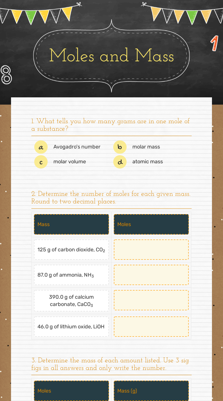 Moles and mass practice sheet | Teaching Resources Age range: 14-16. Lots of practice on moles = mass/Ar and moles = mass/Mr. Works through from easier to more difficult exercises with the last one requiring knowledge of how to put formulae together. Report this resource to let us know if it violates our terms and conditions. Our customer service team will review your report and will be in touch.