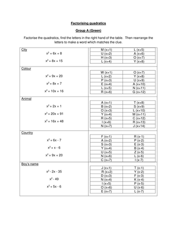 Worksheet on Factoring Quadratic Trinomials | Factoring Quadratic... 1. Factorize the quadratic trinomials 8th Grade Math Practice. Math Homework Sheets. From Worksheet on Factoring Quadratic Trinomials to HOME PAGE. practice worksheet factoring quadratics - Bing May 26, 2021 · Practice worksheet factoring quadratics answers. Solve quadratic equations by factoring. The box method involves making a My students need to practice factoring quadratics, but worksheet after worksheet gets boring. I put together this BINGO game (called FACTO) to get... Factoring Quadratics Practice | PDF | Factorization | Quadratic... factoring quadratic trinomials worksheet pdf. Factor, write prime.Elementary Algebra Skill. Solving Quadratic Equations by Factoring. factoring quadratics educacion publica en mexico pdf practice pdf. Solve each equation by edit pdf files factoring. Intermediate Algebra Skill. Factorising Quadratics - GCSE Maths - Steps, Examples & Worksheet How to factorise quadratics: ax2 + bx + c Factorising quadratics examples: ax2 + bx + c Practice There are also factorising quadratics worksheets based on Edexcel, AQA and OCR exam Write one factor in the first bracket and the other factor in the second bracket. The order isn't important...