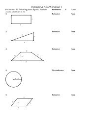 Area and Perimeter Worksheets | Worksheet 1 1) Find the perimeter of the shaded region if each square is 1 unit long. Perimeter of shaded region = ____ units 2) The perimeter of the shape is 20 units. Find its missing side. a. 6 units b. 7 units c. 5 units Area and Perimeter Worksheet 1 PDF Perimeter and Circumference - McNabbs Perimeter and Circumference 1) Perimeter = _48 ft. _____ 2) Perimeter = _52 yds._____ 3) Perimeter = _60 ft._____ 4) Perimeter = _14 mi._____ HINT: This is a parallelogram. les 4 miles 5) You are building a fence to enclose a garden in your back yard. How much fencing do you need to buy from the store? 60 ft 15 ft 9 ft 10 yards rds 20 feet PDF 1.7 Introduction to Perimeter, Circumference, and Area 1.7 Introduction to Perimeter, Circumference, and Area 53 USING A PROBLEM-SOLVING PLAN A problem-solving plan can help you organize solutions to geometry problems. Using the Area of a Rectangle SOCCER FIELD You have a part-time job at a school. You need to buy enough grass seed to cover the school's soccer field. Grade 7 Perimeter and Area Worksheets - WorkSheets Buddy Nov 10, 2020 · Grade 7 Maths Perimeter and Area True(T) or False(F) 1. All the triangles that are equal in area are congruent. 2. All congruent triangles are equal in area. 3. Ratio of the circumference and the diameter of a circle is more than 3. 4.