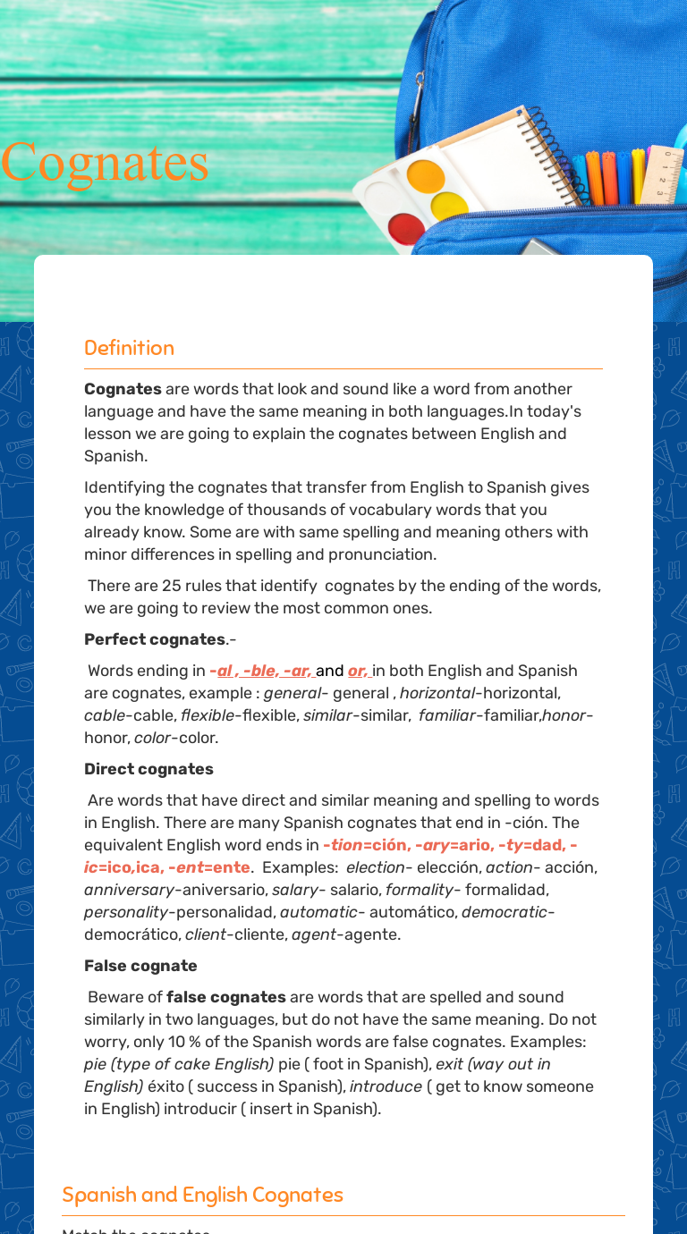 Cognates between Spanish and English | Interactive Worksheet by... Cognates: Words that look and sound like a word from another language and have the SAME meaning in both languages. Some have the same exact Drag the line to match the Spanish and English cognates from left to right. You can also click the right side and then click the matching left side--both...