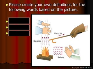 Conduction, Convection, and Radiation Heat Energy Transfer Coduction, convection and radiation. hmsoh. Transfer of Heat. Heat Transfer Lesson PowerPoint, Convection, Conduction, Radiation, Labs. 3 nt chapter 8 heat transfer classnotes answer. Convection is the process whereby heat is transferred by the mass movement of molecules from one place to another. SOLUTION: Methods of Heat Transfer Conduction Convection... (conduction, convection, and radiation). Define conduction: the transferring of thermal energy through direct contact. Identify the method of heat transfer that takes place in each illustration. Some. illustrations may show more than one form of heat transfer. Heat Transfer: Conduction, Convection, and Radiation Heat Transferconductionconvectionand Radiation Worksheets - there are 8 printable worksheets for this topic. Some of the worksheets displayed are Work methods of heat transfer conduction, Work methods of heat transfer Conduction Convection Or Radiation Worksheet Answer Key.