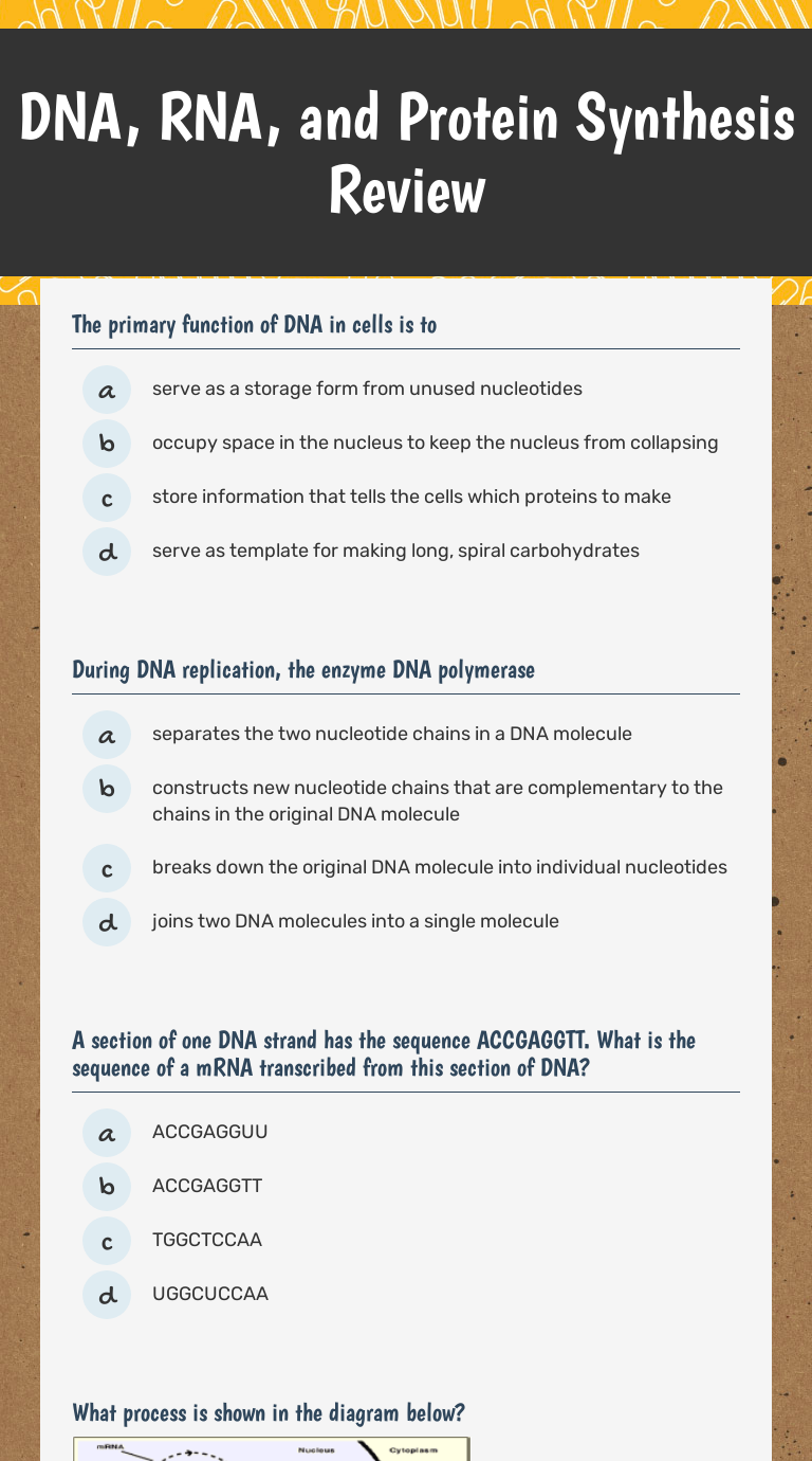 Worksheet on dna rna and protein synthesis. PDF DNA Protein Synthesis Test - Weebly a. DNA b. Fats c. RNA d. Amino acids Compare & Contrast DNA & RNA Found in the nucleus DNA Only Both DNA & RNA RNA Only Contains Adenine, Guanine and Cytosine Contains one strand of nucleotides Contains two strands of Contains a genetic code nucleotides Found outside of the nucleus Has more than one type Pairs A-T, T-A, G-C & C-G DOCX Worksheet on DNA and RNA - EPHS Knowles Biology Worksheet on DNA, RNA, and Protein Synthesis. ... _____ are the primary enzymes that synthesize RNA copies from DNA. These enzymes bind to specific regions of the DNA molecule called _____. This marks the beginning of the section of the DNA molecule that will be _____. ... Worksheet on DNA and RNA Last modified by: Worksheet On Dna Rna And Protein Synthesis Answers Worksheet on dna rna and protein synthesis answers. Ppt video online download 156743 dna replication worksheet answer key 1 pdf name i l e period. Dna replication worksheet watch the animations and answer 156742 dna the double helix answer key. Hydrogen bonds the nitrogen bases are held together in the center of the molecule by. Worksheet On Dna Rna And Protein Synthesis Answer Key Pdf Rna and protein synthesis dna rna practice displaying top 8 worksheets found for this concept. .is protein synthesis different from dna replication 3 review why is the genetic code considered universal infer in what way does controlling write a question about that component and use it to form a hypothesis that could be tested in an experiment ...