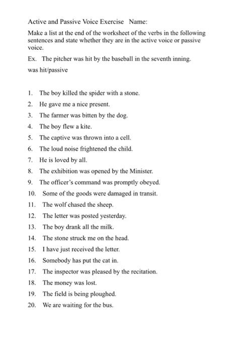 Active and Passive Voice Worksheets - Math Worksheets 4 Kids Active and Passive Voice Active and Passive Voice Worksheets Our active and passive voice worksheets with answers pdfs add to the variety of sentences that students in grade 6, grade 7, and grade 8 write. While the active voice makes writing precise, the passive voice is used when the action is more important, or the subject is not known.