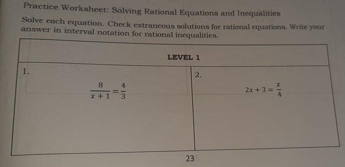 Solved Practice Worksheet: Solving Rational Equations and ... Algebra questions and answers; Practice Worksheet: Solving Rational Equations and Inequalities Solve each equation. Check extraneous solutions for rational equations. Write your answer in interval notation for rational inequalities. LEVEL 1 1. 2. 8 4 * +13 2x +3 = אן 23 3 +3 1-4 SO 3-6 6. - 9 50 LEVEL 2 7 8. 20 20 2 1 10.