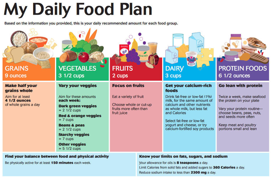 Meal Planning - MyPlate Plan your meals so you eat from all five food groups - fruits, vegetables, grains, protein foods, and dairy or fortified soy products - every day. When planning, be aware of added sugars, saturated fat, and sodium by reading the Nutrition Facts label. Think about your schedule