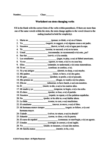 Verb Conjugation (Spanish) - Regular AR, ER and IR verbs ... Verb Conjugation (Spanish) - Regular AR, ER and IR verbs - Present tense See below for a selection of pdf worksheets which you can view online, save, print etc. The worksheets are based on items entered into a text grid using the Grid Match component of TaskMagic3. Present Tense (stem-changing verbs) || Conjuguemos Practice your Spanish verb conjugations for the Present Tense (stem-changing verbs) with graded drill activities and fun multi-player games.