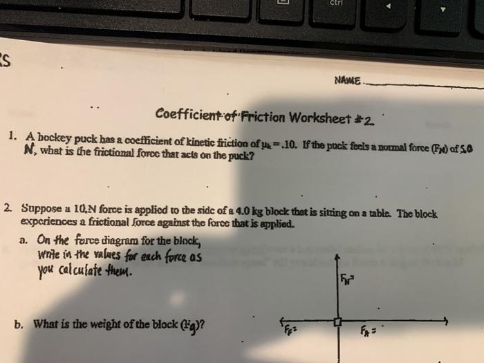 Coefficient Of Friction Worksheet Answers - worksheet Coefficient of friction problems worksheet with answers. Forces worksheet 3 newton s laws problems friction 1. The box has a mass of 20 kg and a force of 200 n is pushing the box to the right. The force of friction acting on the box is 100 n to the left. Coefficient of friction worksheet a hockey puck has a coefficient of kinetic friction of μk 10.