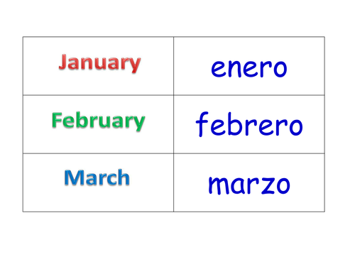 Spanish Days, Months, Numbers, Colours | Teaching Resources Spanish Days, Months, Numbers, Colours. Subject: Spanish. Age range: 11-14. Resource type: Worksheet/Activity. 4.5 25 reviews. tafkam. 4.400884955752213 3393 reviews. Last updated. ... to allow learning and revision of four key vocabulary groups: Days of the Week; Months of the Year; Numbers (1-12) and Colours. Tes classic free licence. Reviews ...