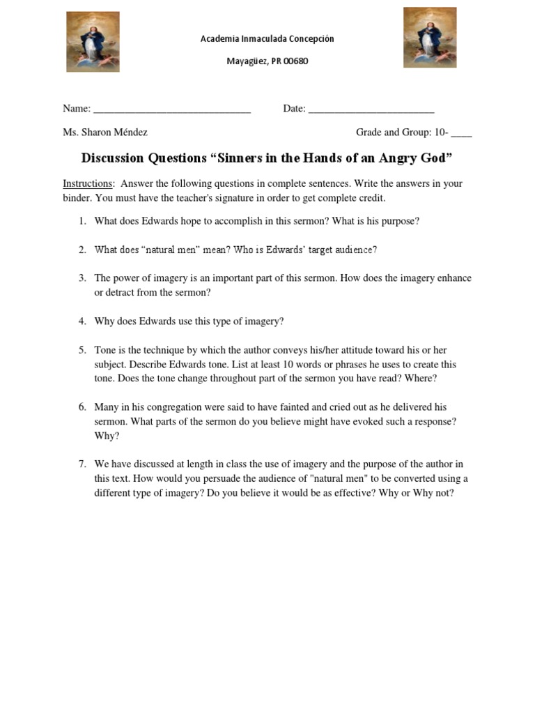 Sinners in the Hands of an Angry God Discussion Questions (Sustitucion 13 de Septiembre de 2013 ...