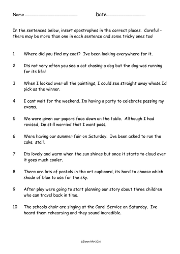 Apostrophes Lesson for Kids: Rules & Examples - Video ... An apostrophe is like a substitute teacher when it's used in a contraction. A contraction is where two words are combined together to make one. Certain letters are removed from the words and... Apostrophes: Possession with Singular, Plural and Multiple ... 1. In contractions. A contraction is when you join two words together into a shortened form and some of the letters drop out. For example, if you want to squeeze do not together into don't, you get... Apostrophe Exercises | Punctuation | KS1 Primary Resources Teaching your students to use and read apostrophes confidently in the classroom is a part of the KS1 SPaG lessons. If you are looking for a range of different ways to teach your KS1 students how to use apostrophes, take a look at our collection of apostrophe exercises.This page contains a selection of our apostrophe exercises to help you plan and deliver excellent … Apostrophe Worksheets High School These worksheets worksheet makers, high school students will need apostrophes of the columns with test prep tips can be helpful. The declarative sentence merely makes a statement. Worksheets worksheet is to school apostrophe worksheets covering various literary works, apostrophes practice commas or indirect objects.