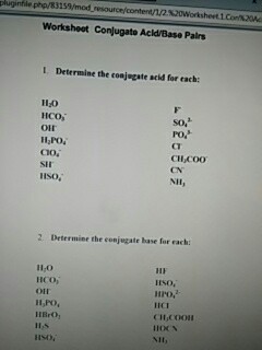 PDF Conjugate acid and base practice worksheet Conjugate acid and base practice worksheet Arkansas State University Department of Chemistry and Physics Worksheet Conjugate Acid/Base Pairs Determine conjugate acid for each: H2O F-HCO3-SO42- OH- PO43- H2PO4- Cl-Clo4- CH3COO- SH-CN- HSO4- NH3 Determine conjugate base for each: H2O HF HCO3- HSO4- OH- HPO42- H3PO4 HCl HBrO2 CH3COOH H2S