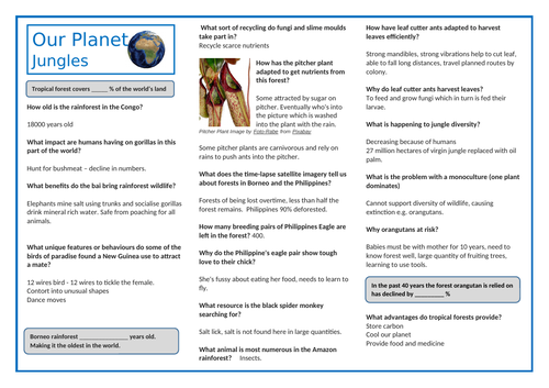 Planet Earth 2 - Jungles / Tropical Rainforest Worksheet Planet Earth 2 - Jungles / Tropical Rainforest Worksheet. Subject: Geography. Age range: 11-14. Resource type: Worksheet/Activity. (no rating) 0 reviews. Geography Shop. 4.5 11 reviews. Geography Teacher based in NW UK.