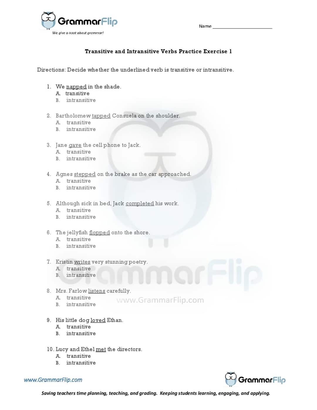 Transitive Verb Worksheet Teaching Resources | Teachers Pay Teachers This formative grammar worksheet measures how well students understand transitive and intransitive verbs. Featuring 20 opportunities to practice application of knowledge, this editable and digital resource is recommended for middle and high school students enrolled in composition classes emphasizing rudimentary writing skills.