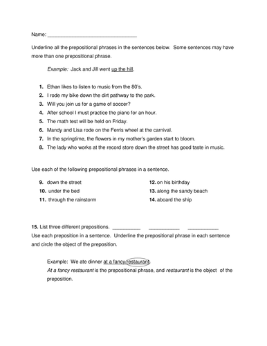 Prepositional phrase worksheet with answers
