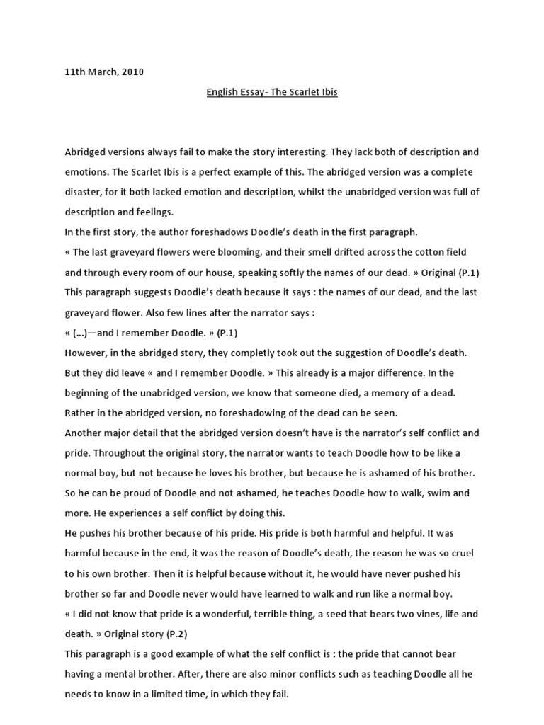 The Scarlet Ibis.pdf - Google Docs The Scarlet Ibis James Hurst It was in the clove of seasons, summer was dead but autumn had not yet been born, that the ibis lit in the bleeding tree. The flower garden was stained with rotting brown magnolia petals, and ironweeds grew rank amid the purple phlox. The five o'clocks by the chimney still marked time, PDF Prompt: "The Scarlet Ibis" After reading "The Scarlet Ibis," select one important theme to write an essay about. Create a specifically worded theme statement which expresses the author's main point, message or lesson in the story. Explore how the author communicates this theme through the relationship between the characters as the story unfolds. Pay special ...