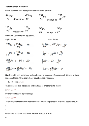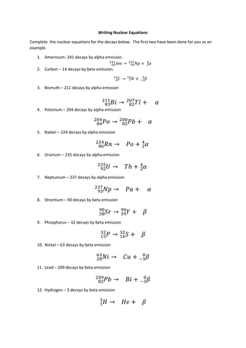Nuclear Equations Teaching Resources | Teachers Pay Teachers In this practice worksheet students will demonstrate balancing nuclear equations for mass and charge and then identifying the reaction as alpha, beta, or neutron decay.Materials needed: noneReformatted for 2022 as a Google Doc!Older PDF version is included in the G-Drive directory.KEY INCLUDED in G-Drive directory. Nuclear decay equations worksheet - Liveworksheets.com Nuclear decay equations. Worksheet to fill in the atomic mass and atomic number of a newly created element after alpha or beta decay. ID: 804276. Language: English. School subject: Physics. Grade/level: GCSE. Age: 13-17. Main content: Nuclear decay. Other contents: Radioactivity, alpha decay, beta decay, nuclear equations. DOC Nuclear decay worksheet - CTE Online Write the complete nuclear equation. electron (e-) → Pd-106 + electron (e-) → In-116 electron (e-) → Ir-190 electron (e-) → Te-123 The following all undergo positron emission. Write the complete nuclear equation. positron (e+) + In-116 positron (e+) + Ni-61 positron (e+) + P-30 positron (e+) + Rb-85