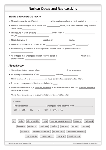 Radioactivity Worksheets - English Worksheets Land Radioactivity Worksheets: The Foundation - Radioactivity was discovered in 1896 by the French physicist Henri Becquerel, who observed it in uranium. Radioactivity refers to the lack of stability in the isotopes that make up certain elements. QUESTIONS: The Foundation - An isotope is an atom that has an equal number of protons and electrons ...