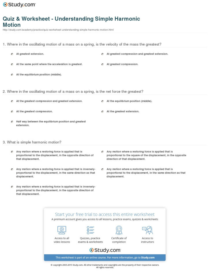 Measuring Simple Harmonic Motion Worksheet Answers Simple Harmonic Motion Worksheet - Ecse 468 - StuDocu. Answers: (a) a = 1 x 10 4 ms-2 (b) v = 21 ms-1, (c) F = 2 x 10 3 N. The graph in the figure shows the variation with time t of the velocity v of a particle executing SHM. (a) Using the graph, estimate the area between the curve and the time axis from 0 s to 0.