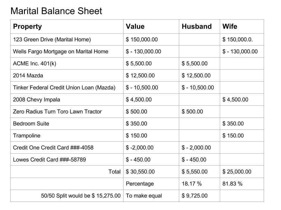 The Ultimate Property Division Spreadsheet | Law Offices Of Greg Enos This ideal spreadsheet can only be prepared after you have both spouse's proposed values and divisions. The spreadsheet has to be printed on very wide ledger size paper (or two letter size pages taped together) and has columns for: — Asset/Debt — Husband's Proposed Value — Wife's Proposed Value — Court's Value (blank - for judge to fill in)