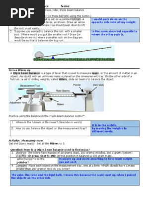 Student Exploration- Triple Beam Balance (ANSWER KEY) - FLIP HTML5 Draw a smaller rock on the diagram above so that it balances the big rock. Gizmo Warm-up A triple beam balance is a type of lever that is used to measure mass, or the amount of matter in an object. An object with an unknown mass is placed on the measurement tray. On the other side of a fulcrum, a set of sliding weights, called riders, slide on ...