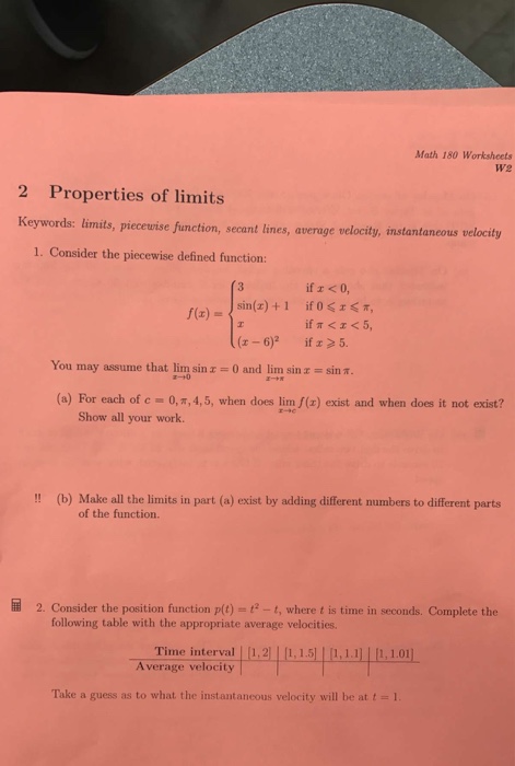 Piecewise Functions Worksheet | Superprof Find the analytical expression of the function. Solution of exercise 1. Graph the piecewise function: Solution of exercise 2. Graph the piecewise function: Solution of exercise 3. Graph the piecewise function: Solution of exercise 4. Graph: Solution of exercise 5. Graph: Solution of exercise 6. Graph: Piecewise Defined Functions Worksheet - onlinemath4all Step 2 : Determine the domain of each segment. Step 3 : For each segment, use the graph to locate points on the line and to find the slope. Step 4 : We can use the slope-intercept form of a linear equation. f (x) = mx + b. to define the function of each segment. The rule for this function is : DOC Worksheet: Piecewise Functions - Deer Valley Unified School District Piecewise Functions Evaluate the function for the given value of x. Match the piecewise function with its graph. Graph the function. 19. 20. 21. Graph the function. 22. 23. 24. 25. 26. 27. Name __________________________ Period: _______ Undergraduate Courses - UCLA Mathematics Undergraduate Courses Lower Division Tentative Schedule Upper Division Tentative Schedule PIC Tentative Schedule CCLE Course Sites course descriptions for Mathematics Lower & Upper Division, and PIC Classes All pre-major & major course requirements must be taken for letter grade only! mathematics courses Math 1: Precalculus General Course Outline Course …