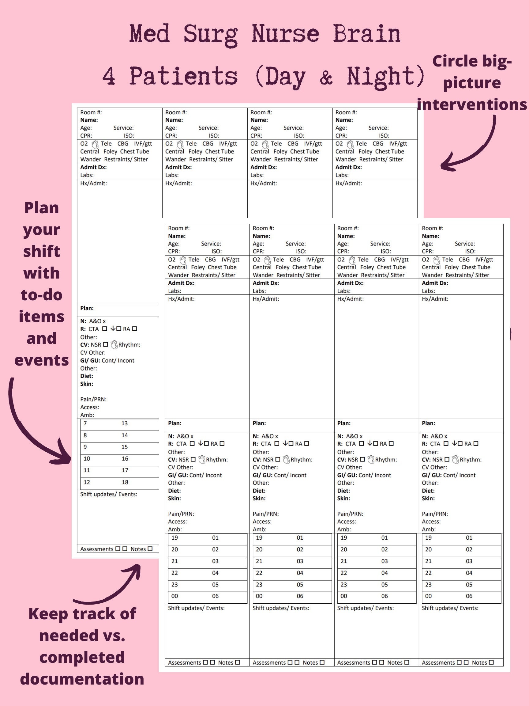 Lab 03 Biological Molecules Short Answers - StuDocu Primary Concepts Of Adult Nursing (NUR 3180) Nursing Concepts II (04940) Introduction to Marketing (MKT-315) family ob/peds (nu402) Care Management 2 (NUR 3219C) Nursing-med surg vsim (Nur 257) General Chemistry II (CHEM M01B ) Introductory Biology: Cell And Developmental Biology (BIOMG 1350) Trending. Organizational Theory and Behavior (BUS5113) 10 Best Med Surg Organization Sheet Printable - printablee.com Med surg organization sheet functions as a journal report. So that tracking can be done in patients who have just had surgery. Not all surgery results are the same for everyone, therefore after surgical treatment is needed. Med Surg Nurse Brain Sheet Template We also have more printable sheet you may like: Printable Group Sheets Med Surg Nursing Worksheet Med Surg Nursing Worksheet. bill nye plants worksheet arabic alphabet worksheet for preschoolers 2 year old learning worksheet budget worksheet dave ramsey algebra order of operations worksheet bohr atomic models worksheet answers blank world map worksheet 3 year old preschool worksheet. PDF The Most Trusted Resource for Nursing Students The Most Trusted Resource for Nursing Students